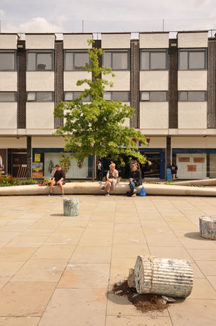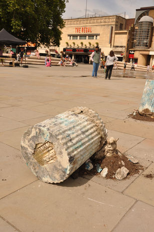 Catriona installed 'Columnated Ruins Domino' on Kings Square - Paper-concrete, (re-cycled Newspaper pulp, Evening standard and London Metro), cement, pigment, welded steel.